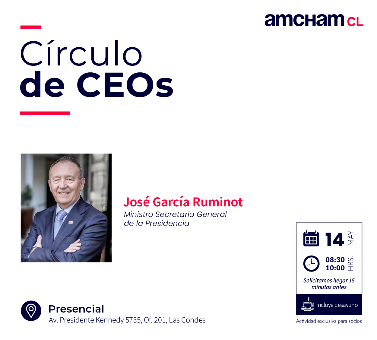 La Cámara Chilena Norteamericana de Comercio, AmCham Chile, en el marco de su agenda de trabajo con las nuevas autoridades de gobierno, realizará una nueva sesión del Círculo de CEOs con el Ministro Secretario General de la Presidencia, José García Ruminot, el jueves 14 de mayo, a las 08:30 hrs., en las oficinas de AmCham Chile, ubicadas en Av. Presidente Kennedy 5735, Of. 201, Torre Poniente, Las Condes.