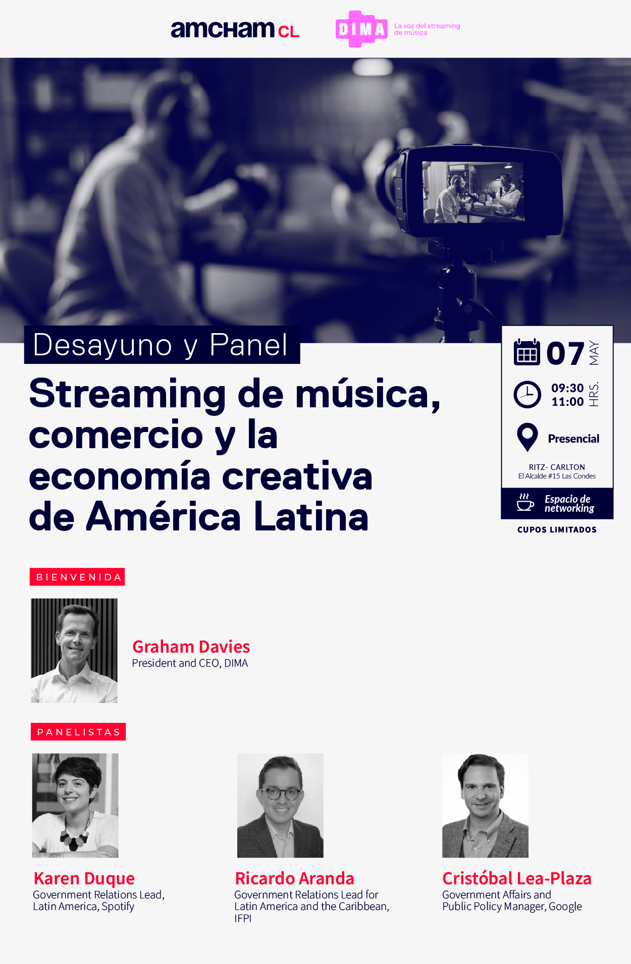 La Cámara Chilena Norteamericana de Comercio, AmCham Chile, en colaboración con la Digital Media Association (DIMA), realizará el desayuno y panel de conversación “Streaming Musical, Comercio y el Futuro de la Economía Creativa de América Latina”, el jueves 7 de mayo, entre las 09:30 y 11:00 hrs., en el Ritz-Carlton Santiago, ubicado en El Alcalde 15, Las Condes.