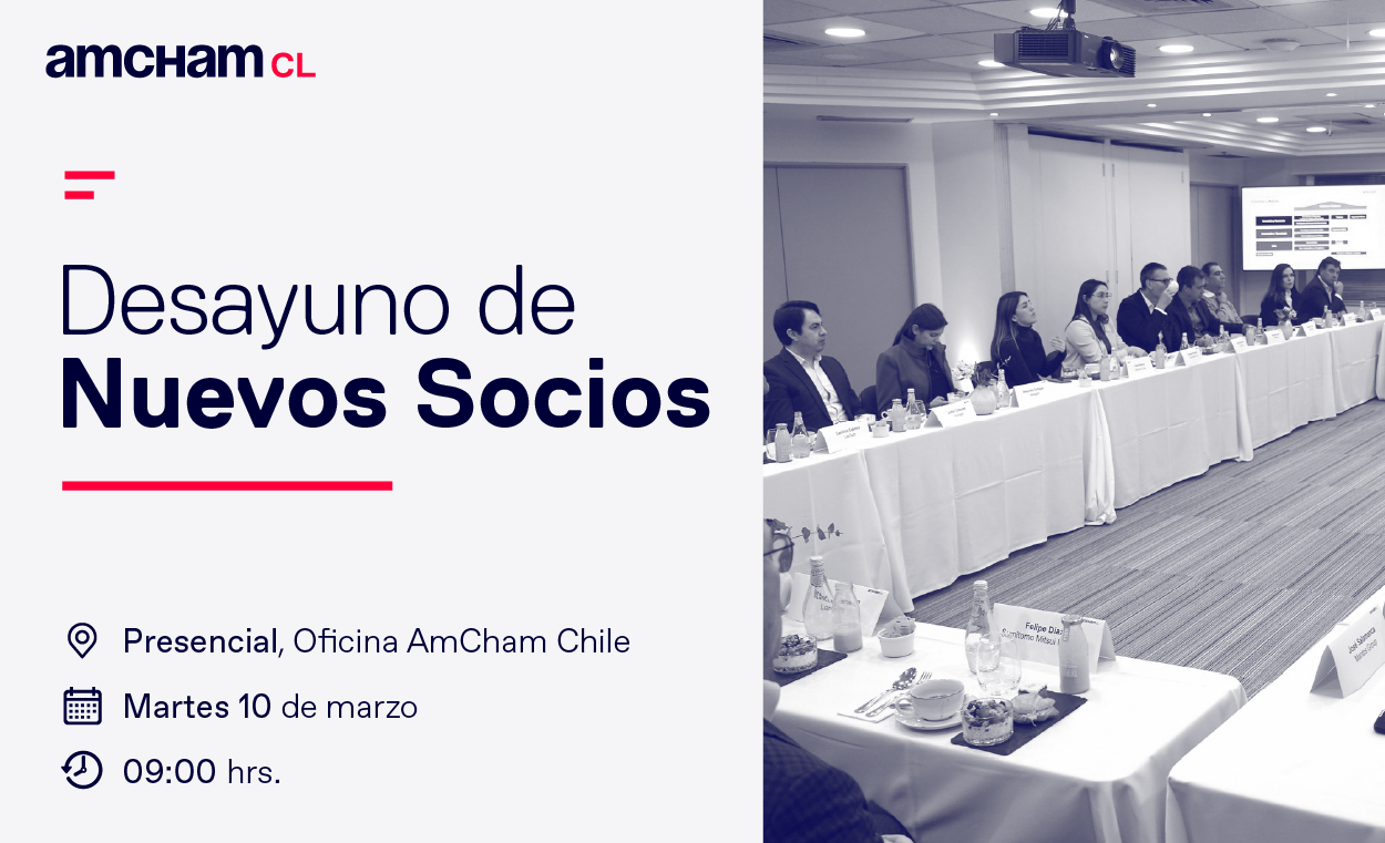 La Cámara Chilena Norteamericana de Comercio, AmCham Chile, realizará un desayuno de bienvenida para nuevos socios el martes 10 de marzo a las 09:00 hrs en las oficinas de AmCham Chile.