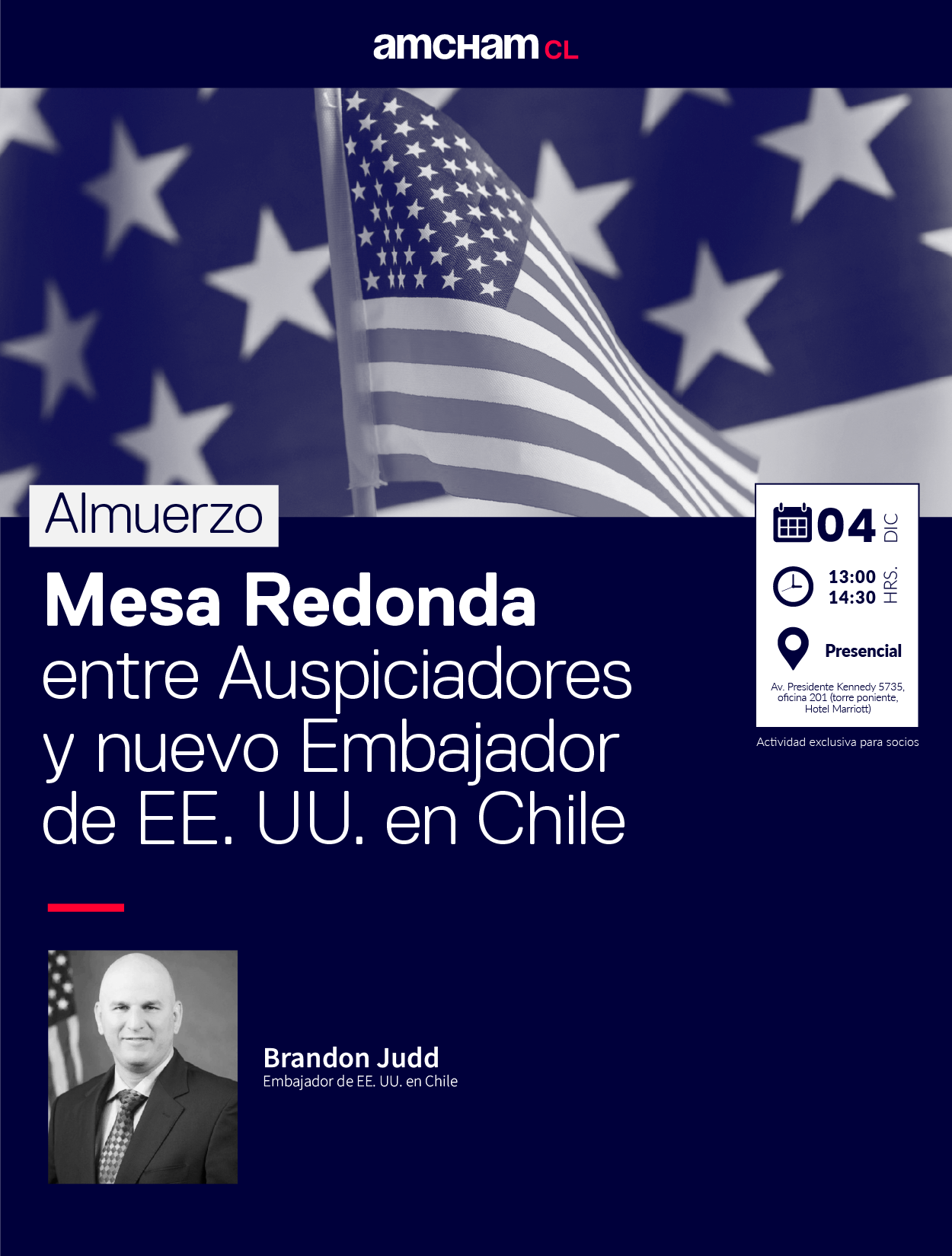 La Cámara Chilena Norteamericana de Comercio, AmCham Chile, realizará una mesa redonda junto al nuevo embajador de Estados Unidos en Chile, Brandon Judd, el jueves 4 de diciembre, a las 13:00 hrs, en las oficinas de AmCham Chile.