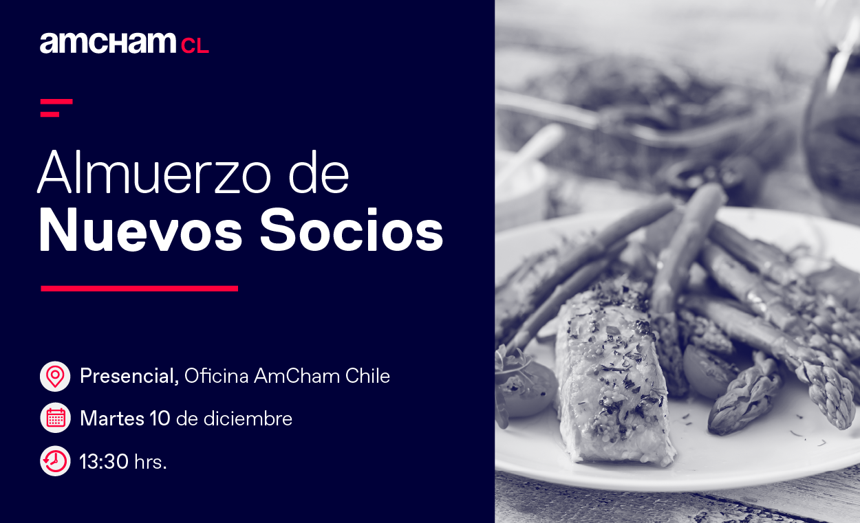 La Cámara Chilena Norteamericana de Comercio, AmCham Chile, tiene el agrado de invitarte a participar de un almuerzo en nuestras oficinas para darle la bienvenida a los nuevos socios. Esta instancia se realizará el martes 10 de diciembre a las 13:30 horas junto a Roberta Valenca, presidenta de AmCham Chile, y miembros de nuestro Directorio.