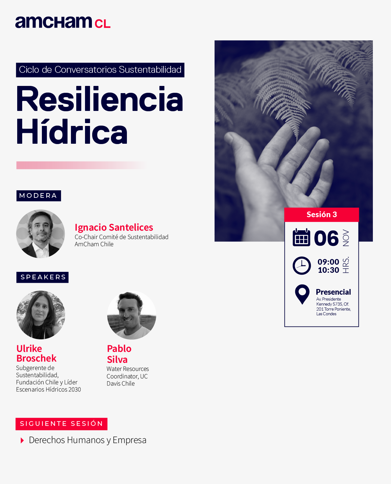 Contaremos con la participación de Ulrike Broschek, Subgerente de Sustentabilidad de Fundación Chile y Líder Escenarios Hídricos 2030, y Juan Pablo Silva, Water Resources Coordinator de UC Davis Chile, en un conversatorio moderado por Ignacio Santelices, co-Chair del Comité de Sustentabilidad AmCham y Gerente de Sustentabilidad de la Fundación Chile.