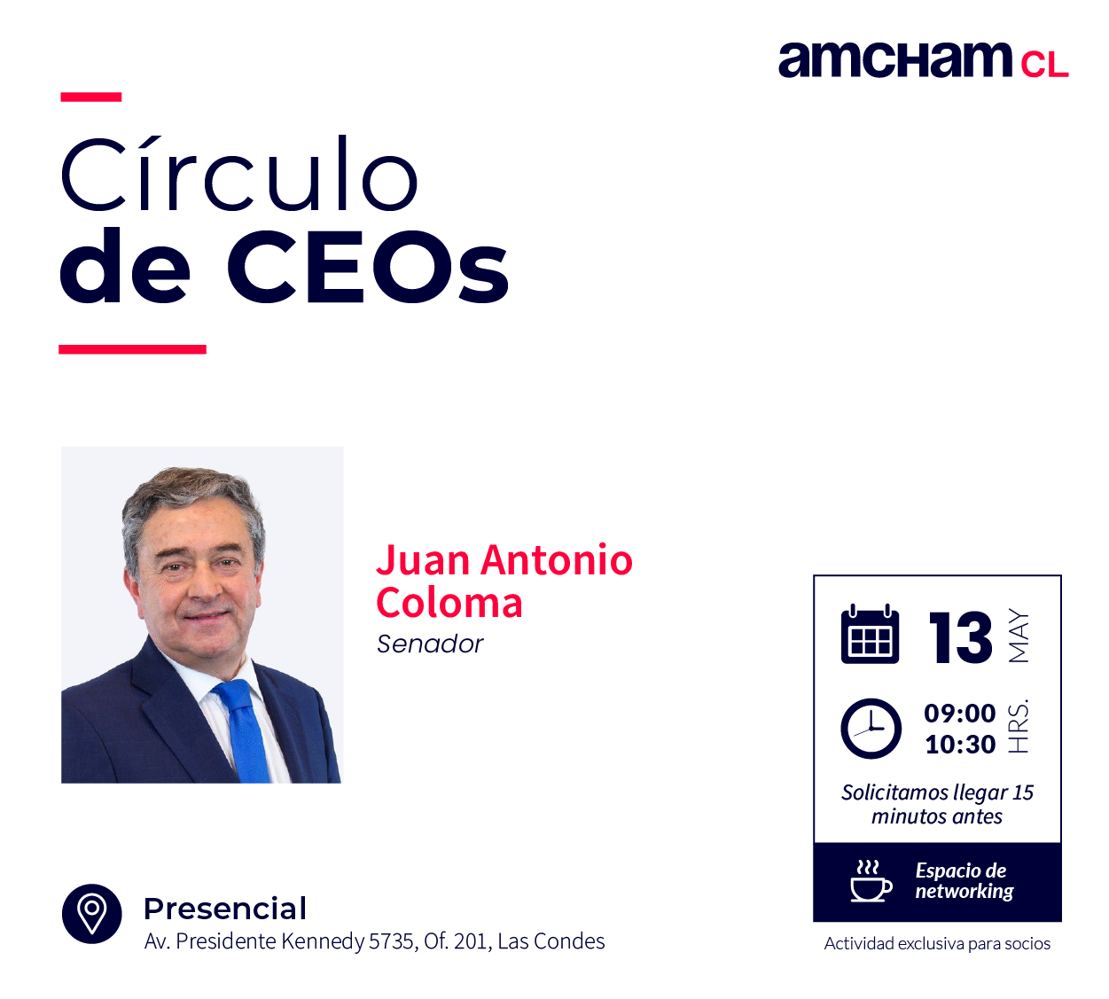 La actividad será un desayuno que tendrá lugar el lunes 13 de mayo, entre las 09:00 y 10:30 hrs., en oficinas de AmCham Chile.
