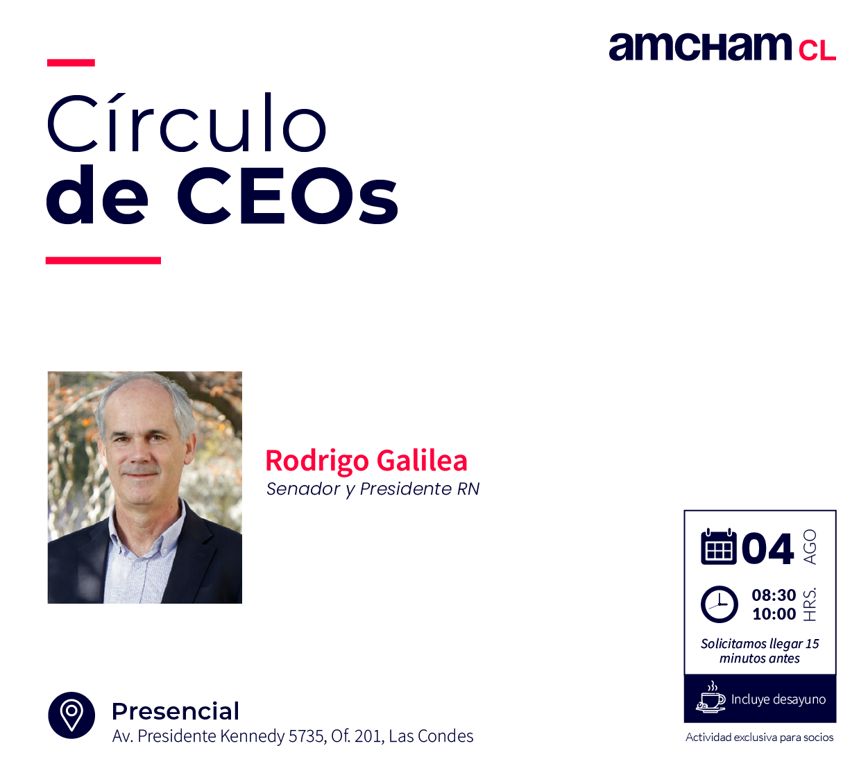 La Cámara Chilena Norteamericana de Comercio, AmCham Chile, realizará una nueva sesión del Círculo de CEOs en el marco de su ciclo de encuentros con presidentes de partidos políticos, el lunes 4 de agosto, a las 08:30 hrs, en las oficinas de AmCham Chile, ubicadas en Av. Presidente Kennedy 5735, Torre Poniente, oficina 201, Las Condes.