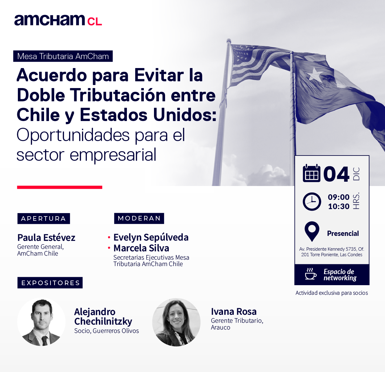 La Mesa Tributaria de AmCham Chile, te invita a participar del conversatorio «Acuerdo para Evitar la Doble Tributación entre Chile y Estados Unidos: Oportunidades para el sector empresarial», a realizarse el lunes 4 de diciembre entre las 09:00 y 10:30 hrs.