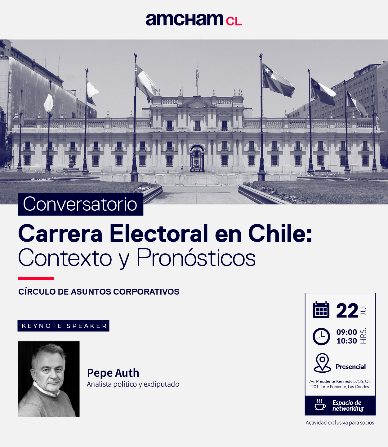 La Cámara Chilena Norteamericana de Comercio, AmCham Chile, a través de su Círculo de Asuntos Corporativos, realizará el conversatorio “Carrera Electoral en Chile: Contexto y Pronósticos”, el martes 22 de julio, entre las 09:00 y 10:30 hrs, en las oficinas de AmCham Chile, ubicadas en Av. Presidente Kennedy 5735, Torre Poniente, oficina 201, Las Condes.