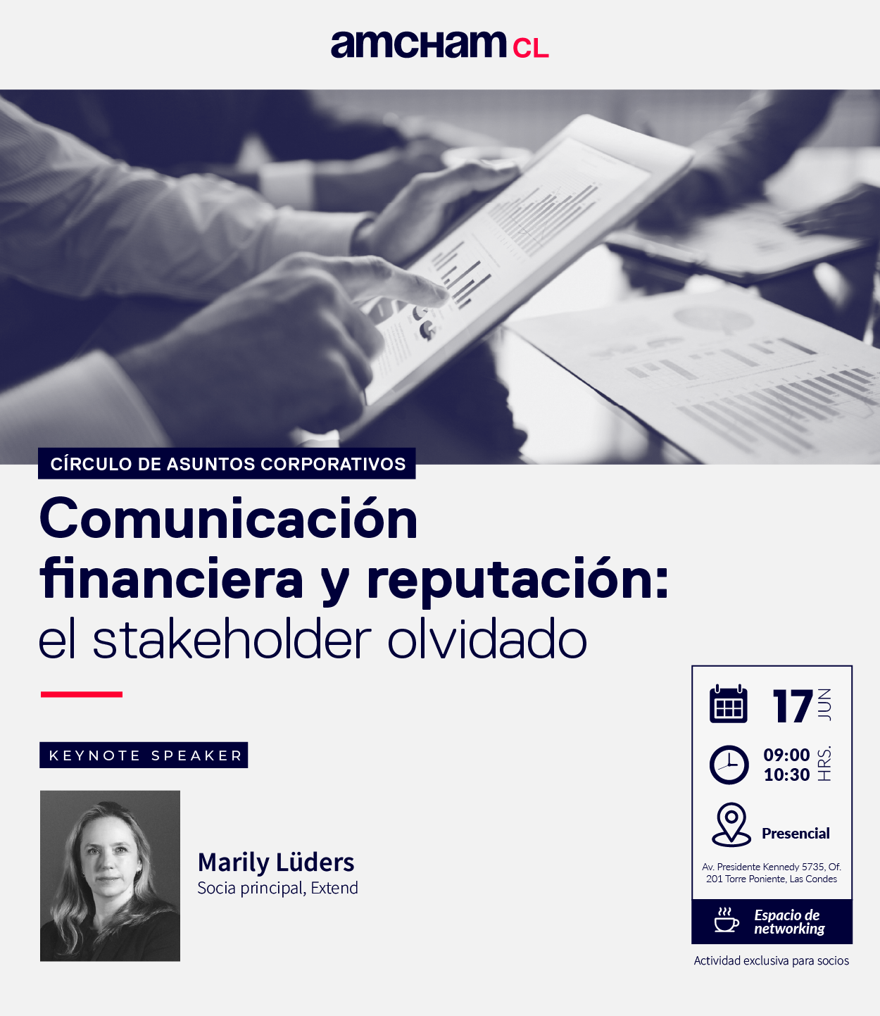 La Cámara Chilena Norteamericana de Comercio, AmCham Chile, a través de su Círculo de Asuntos Corporativos, realizará el conversatorio “Comunicación Financiera y Reputación: El Stakeholder Olvidado”, el martes 17 de junio, entre las 09:00 y 10:30 hrs, en las oficinas de AmCham Chile, ubicadas en Av. Presidente Kennedy 5735, Torre Poniente, oficina 201, Las Condes.