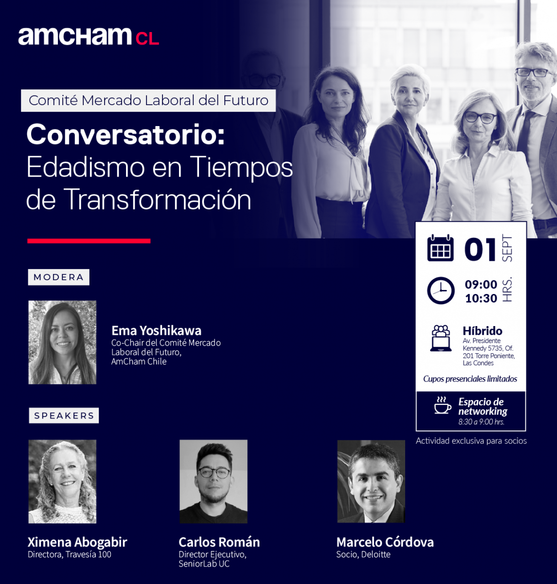 La Cámara Chilena Norteamericana de Comercio, AmCham Chile, a través del Comité del Mercado Laboral del Futuro, realizará el conversatorio «Edadismo en Tiempos de Transformación» el próximo 01 de septiembre de 09:00 a 10:30 horas.