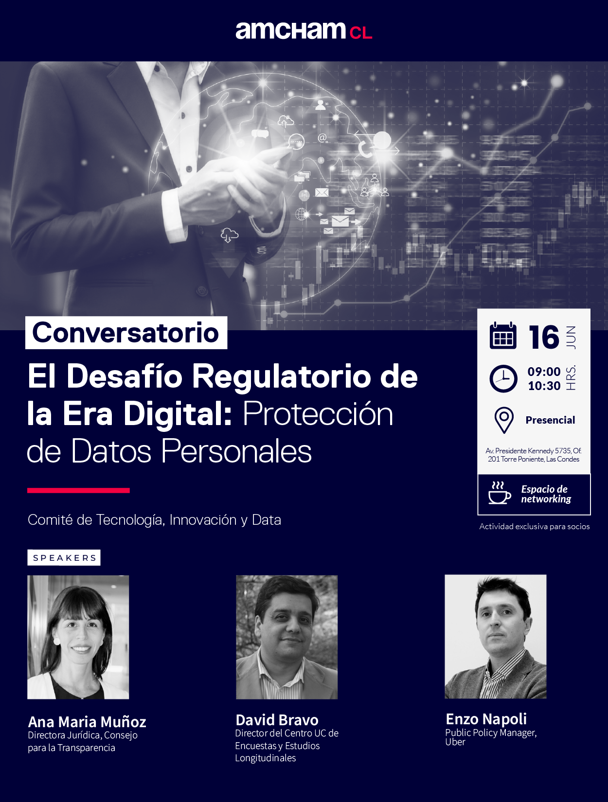 La Cámara Chilena Norteamericana de Comercio, AmCham Chile, a través de su Comité de Tecnología, Innovación y Data, realizará el conversatorio “El Desafío Regulatorio de la Era Digital: Protección de Datos Personales”, el lunes 16 de junio, entre las 09:00 y 10:30 hrs, en las oficinas de AmCham Chile, ubicadas en Av. Presidente Kennedy 5735, Torre Poniente, oficina 201, Las Condes.