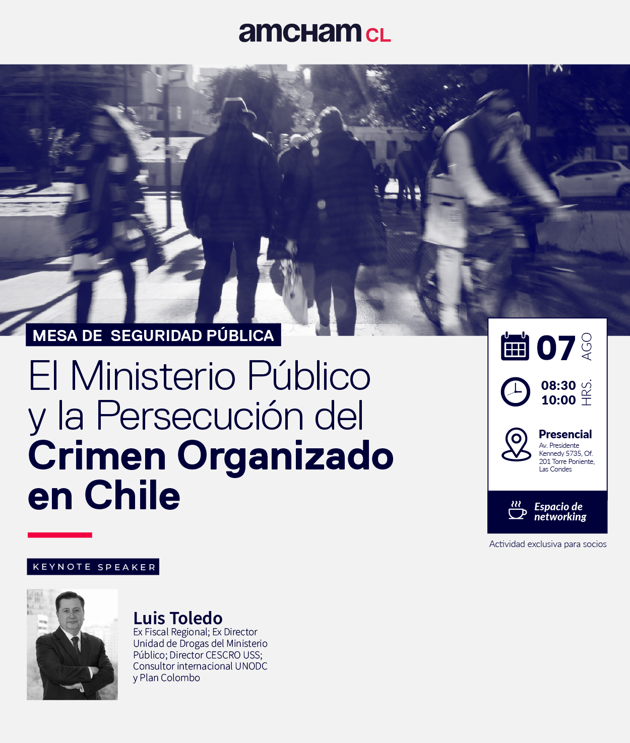 La Cámara Chilena Norteamericana de Comercio, AmCham Chile, a través de su Mesa de Seguridad Pública, en conjunto con AthenaLab, realizará el conversatorio “El Ministerio Público y la Persecución del Crimen Organizado en Chile”, el jueves 7 de agosto, entre las 08:30 y 10:00 hrs, en las oficinas de AmCham Chile, ubicadas en Av. Presidente Kennedy 5735, Torre Poniente, oficina 201, Las Condes.