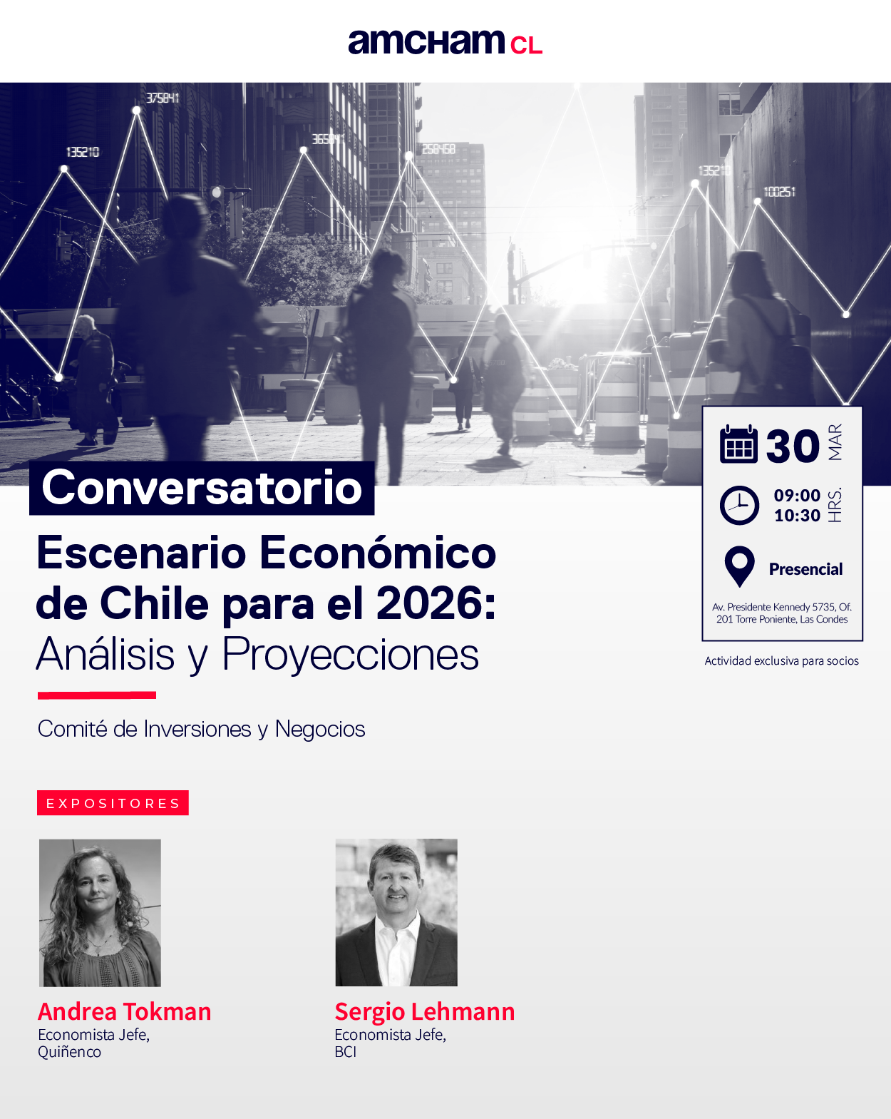 La Cámara Chilena Norteamericana de Comercio, AmCham Chile, a través de su Comité de Inversiones y Negocios, realizará el conversatorio «Escenario Económico de Chile para el 2026: Análisis y Proyecciones», el lunes 30 de marzo, entre las 09:00 y 10:30 hrs., en las oficinas de AmCham Chile.