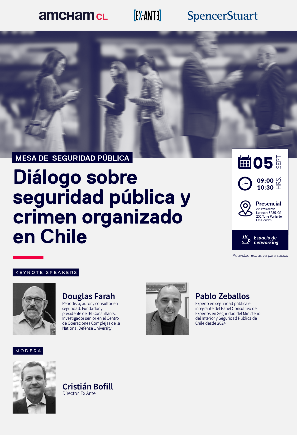 La Cámara Chilena Norteamericana de Comercio, AmCham Chile, en colaboración con Ex-Ante y Spencer Stuart, realizará el conversatorio “Estrategias para enfrentar el crimen organizado: Diálogo sobre seguridad pública en Chile”, el viernes 5 de septiembre, entre las 09:00 y 10:30 hrs, en las oficinas de AmCham Chile, ubicadas en Av. Presidente Kennedy 5735, Torre Poniente, oficina 201, Las Condes.