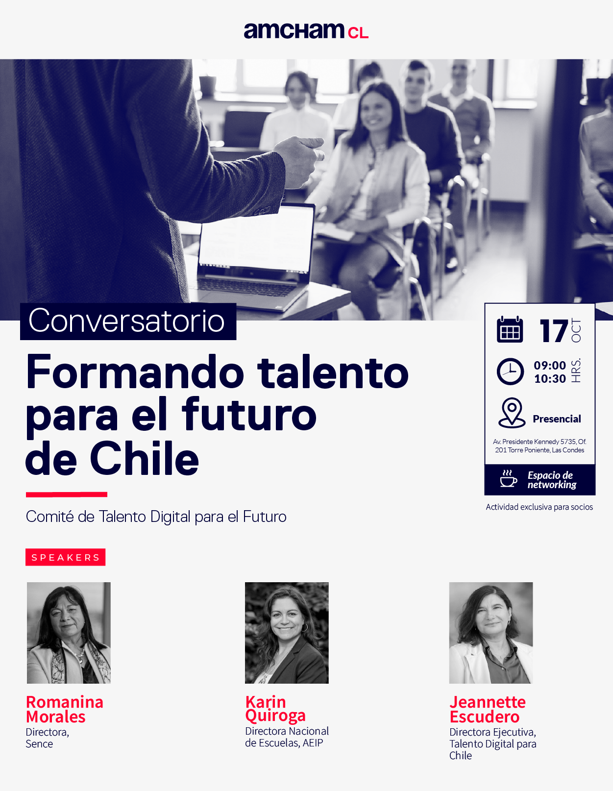 La Cámara Chilena Norteamericana de Comercio, AmCham Chile, a través de su Comité de Talento Digital para el Futuro, realizará el conversatorio “Formando talento para el futuro de Chile”.