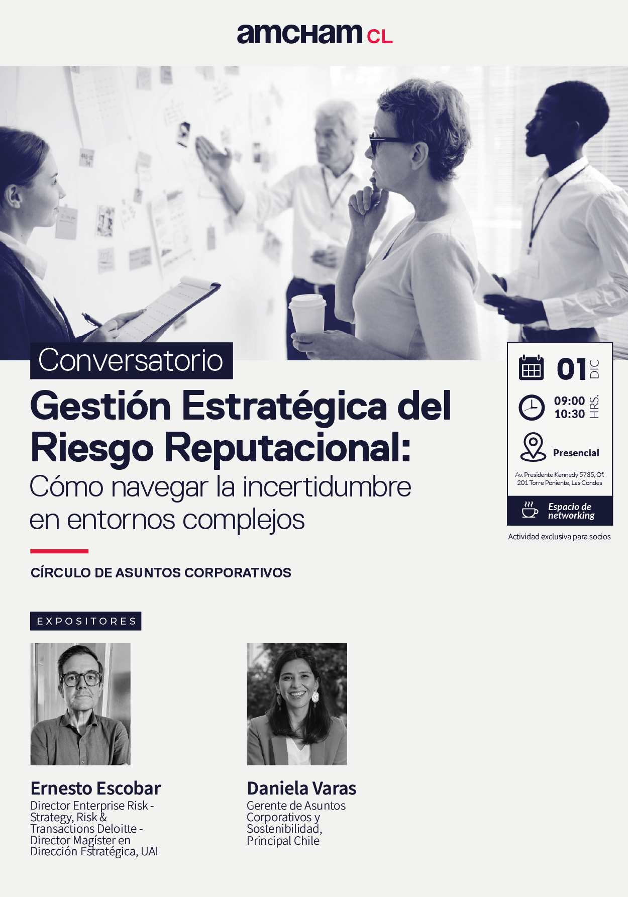 La Cámara Chilena Norteamericana de Comercio, AmCham Chile, a través de su Círculo de Asuntos Corporativos, realizará el conversatorio “Gestión Estratégica del Riesgo Reputacional: Cómo navegar la incertidumbre en entornos complejos”, el lunes 1 de diciembre, entre las 09:00 y 10:30 hrs, en las oficinas de AmCham Chile.