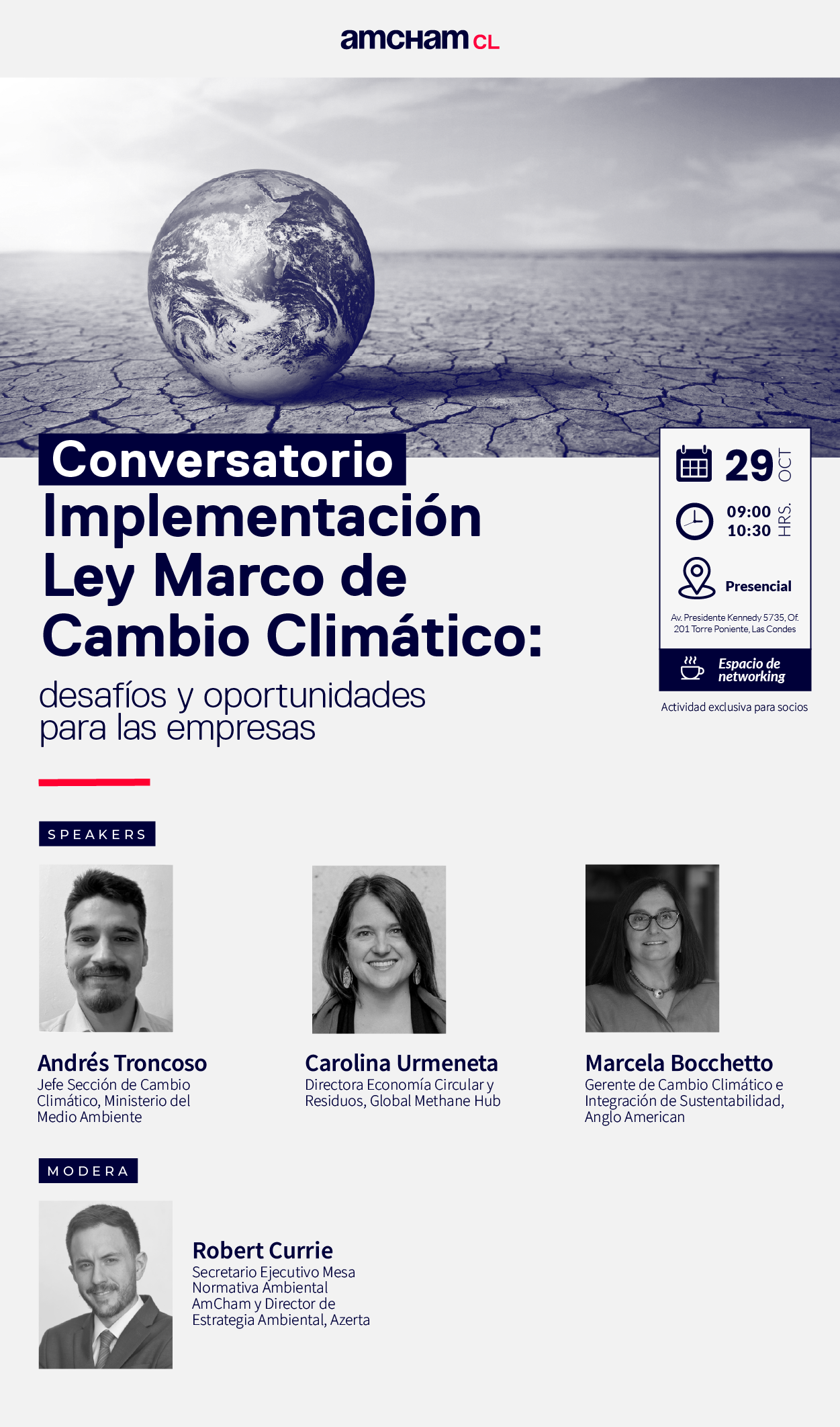 La Cámara Chilena Norteamericana de Comercio, AmCham Chile, a través de su Mesa de Normativa Ambiental, realizará el conversatorio “Implementación de la Ley Marco de Cambio Climático: Desafíos y oportunidades para las empresas”.