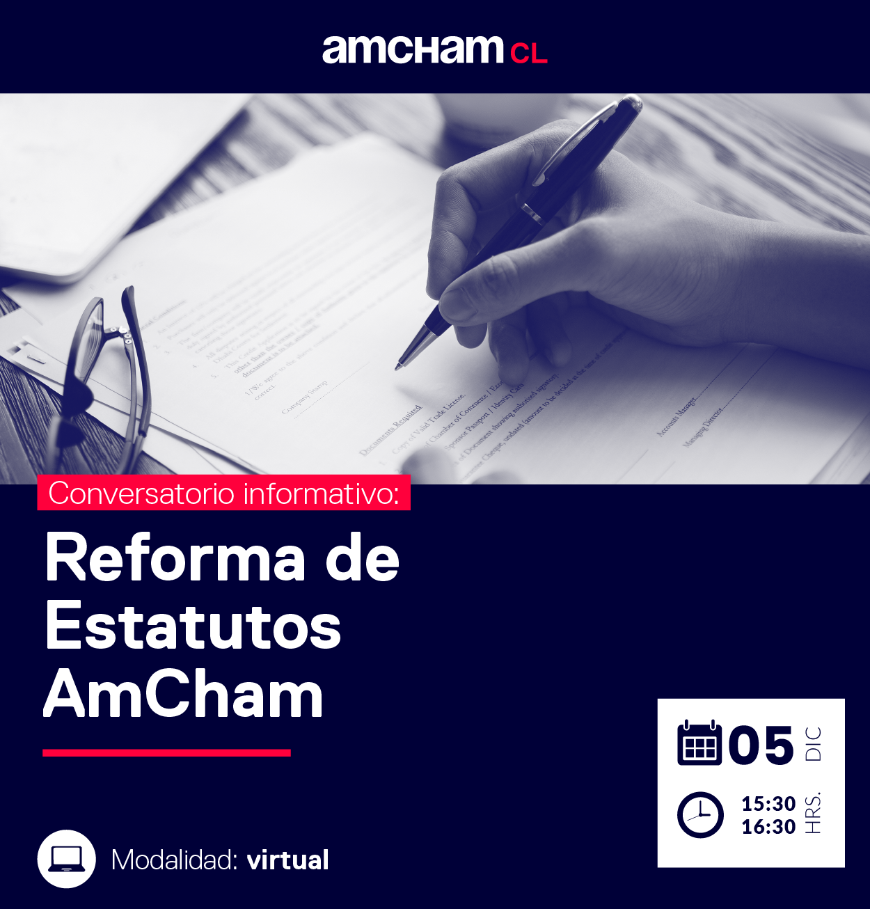 Con el fin de informar sobre el proceso de reforma de estatutos que estamos llevando a cabo como Cámara Chileno Norteamericana de Comercio, AmCham Chile, te invitamos a participar de un conversatorio informativo virtual el próximo 05 de diciembre a las 15:30 horas, en el cual daremos a conocer las principales modificaciones propuestas al texto, para facilitar su participación y voto en la próxima Asamblea.