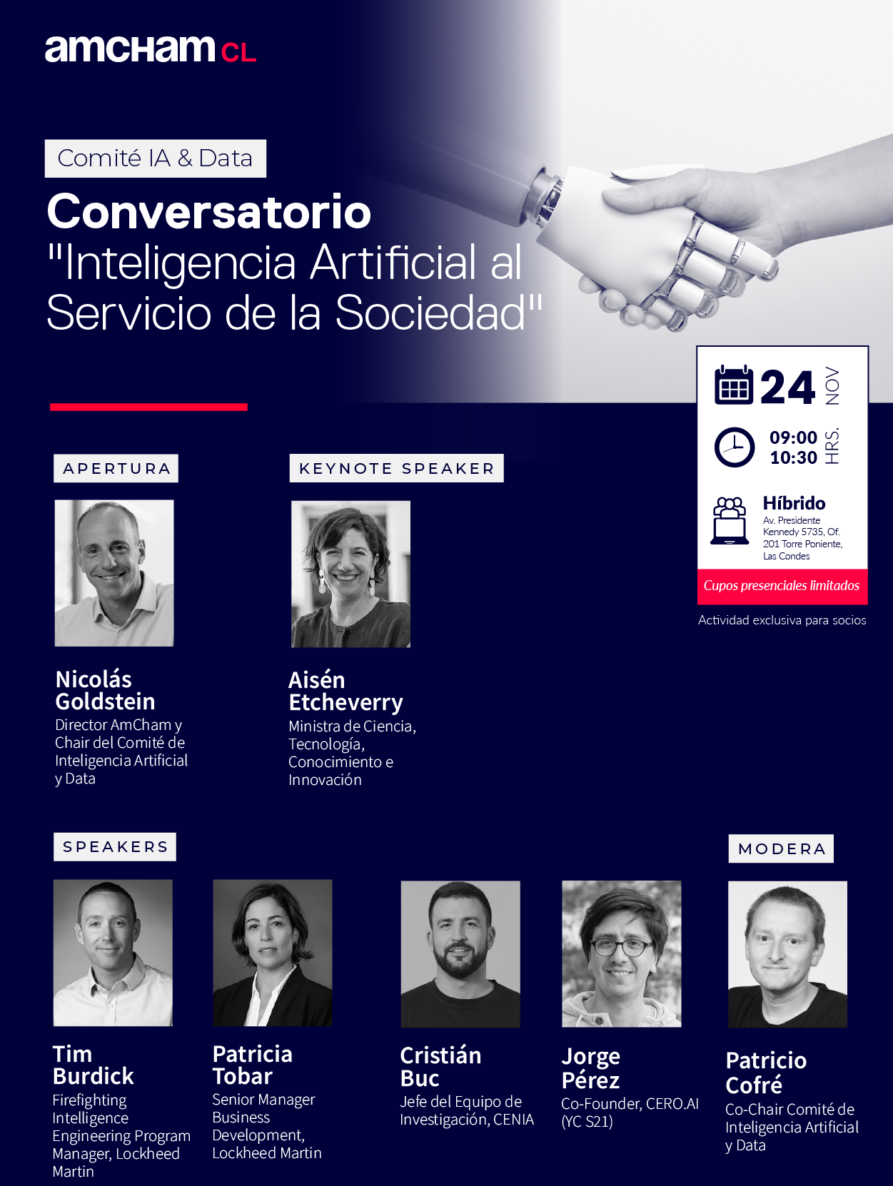 La Cámara Chilena Norteamericana de Comercio, AmCham Chile, a través del Comité de Inteligencia Artificial y Data, te invita al Conversatorio «Inteligencia Artificial al Servicio de la Sociedad», a realizarse el próximo 24 de noviembre de 09:00 a 10:30 horas.