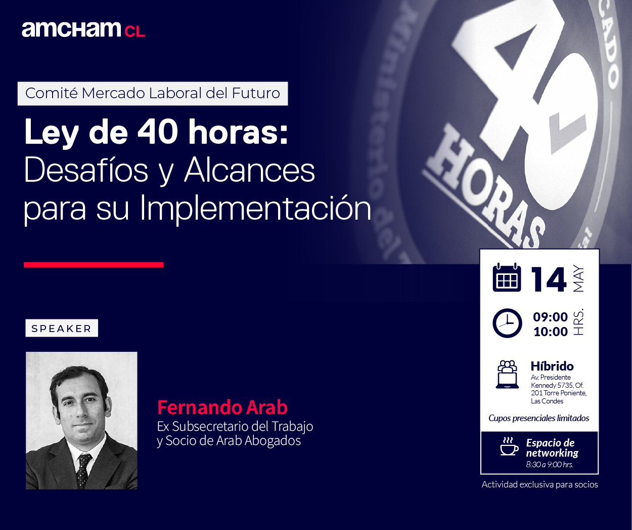 La Cámara Chilena Norteamericana de Comercio, AmCham Chile, a través del Comité Mercado Laboral del Futuro, te invita al Conversatorio «Ley de 40 horas: Desafíos y Alcances para su Implementación», a realizarse el próximo 14 de mayo de 09:00 a 10:00 horas.