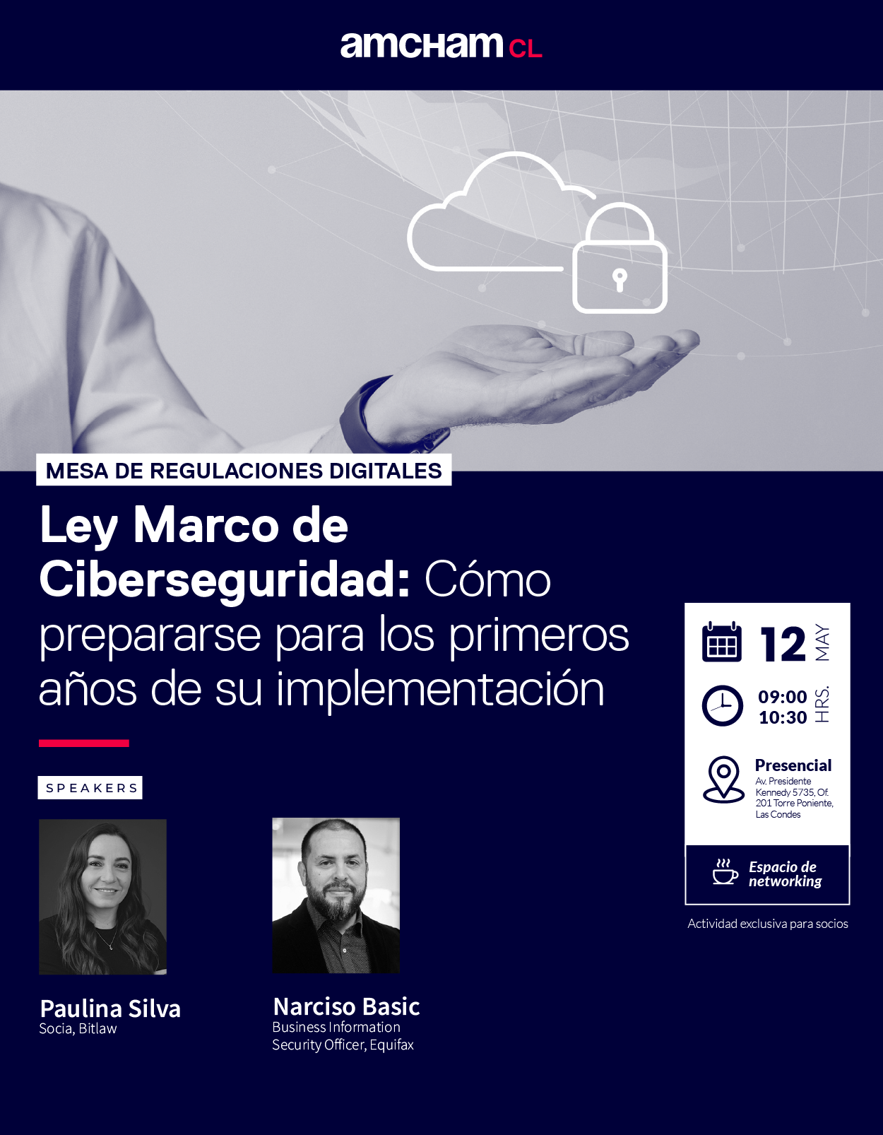 La Cámara Chilena Norteamericana de Comercio, AmCham Chile, a través de la Mesa de Regulaciones Digitales, realizará el conversatorio “Ley Marco de Ciberseguridad: Cómo prepararse para los primeros años de su implementación”.