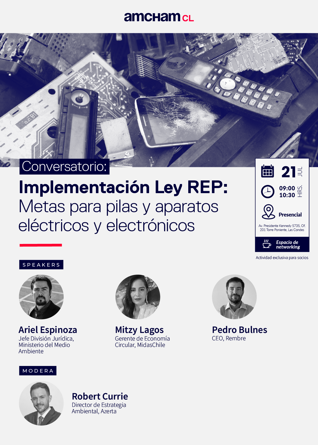 La Cámara Chilena Norteamericana de Comercio, AmCham Chile, a través de su Mesa de Normativa Ambiental, realizará el conversatorio “Implementación de la Ley REP: Metas para Pilas y Aparatos Eléctricos y Electrónicos”, el lunes 21 de julio, entre las 09:00 y 10:30 hrs, en las oficinas de AmCham Chile, ubicadas en Av. Presidente Kennedy 5735, Torre Poniente, oficina 201, Las Condes.