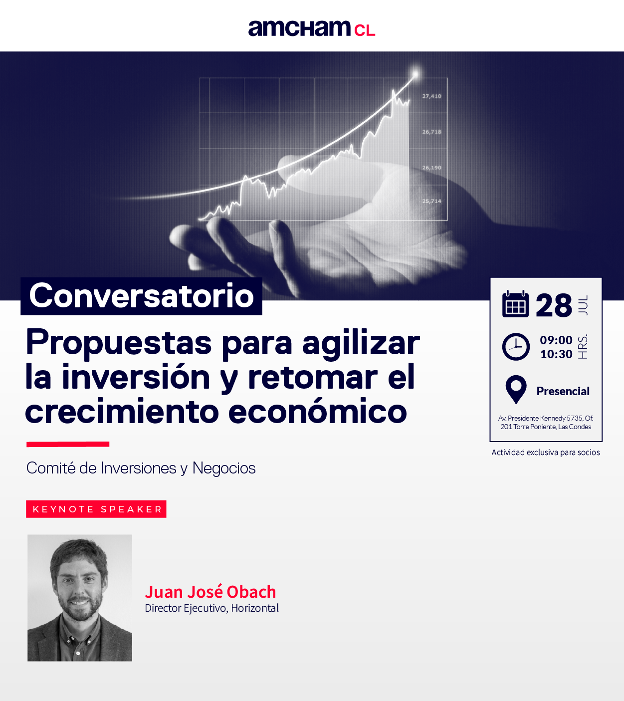 La Cámara Chilena Norteamericana de Comercio, AmCham Chile, a través de su Comité de Inversiones y Negocios, realizará el conversatorio “Propuestas para agilizar la inversión y retomar el crecimiento económico”, el lunes 28 de julio de 2025, entre las 09:00 y 10:30 hrs, en las oficinas de AmCham Chile, ubicadas en Av. Presidente Kennedy 5735, Torre Poniente, oficina 201, Las Condes.