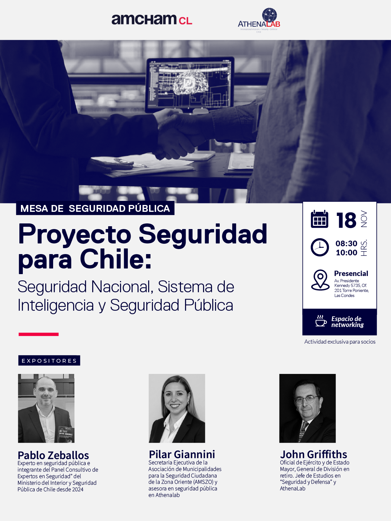 La Cámara Chilena Norteamericana de Comercio, AmCham Chile, a través de su Mesa de Seguridad Pública, realizará el conversatorio “Proyecto Seguridad para Chile de AthenaLab: Seguridad Nacional, Sistema de Inteligencia y Seguridad Pública”.