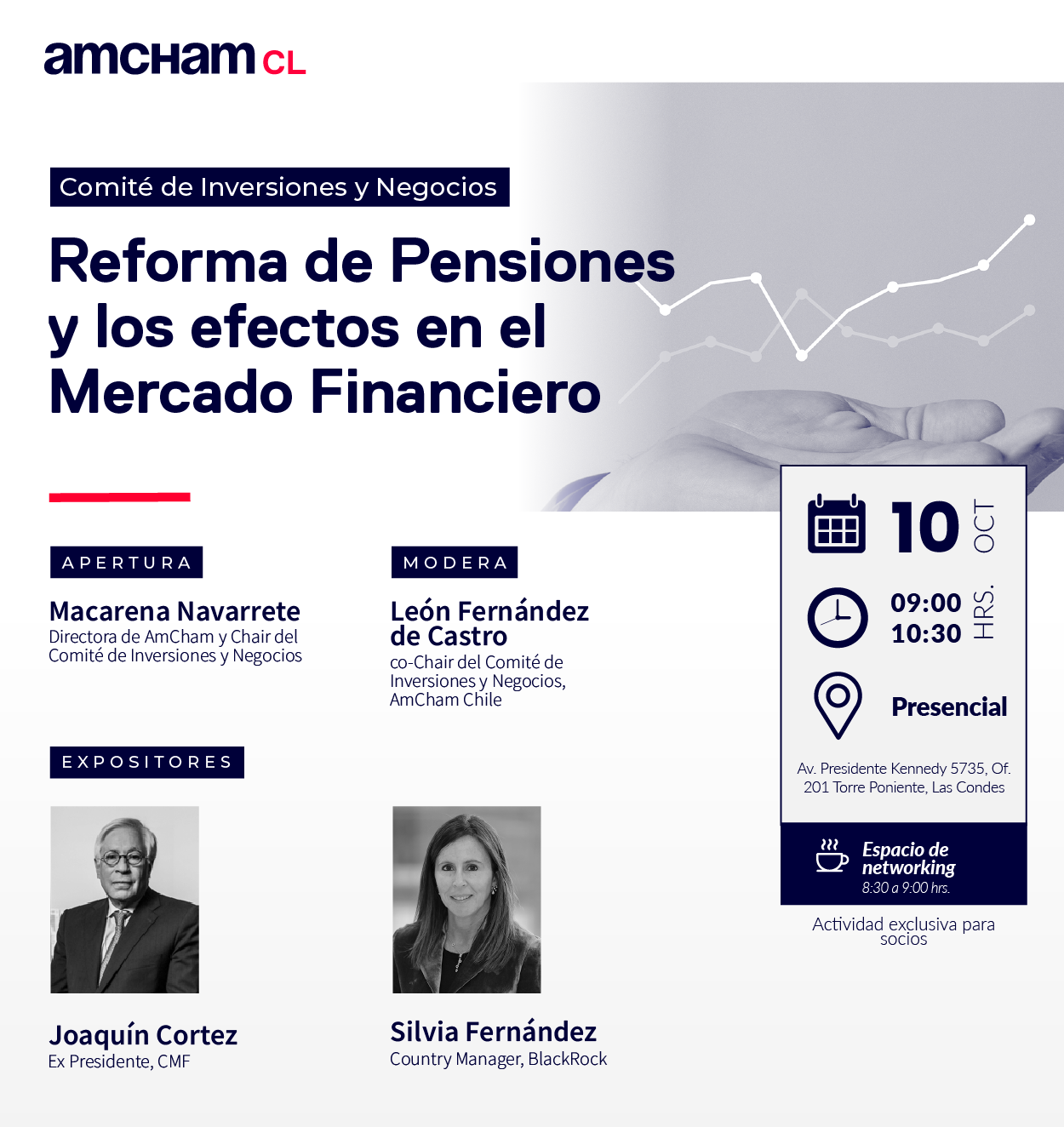 El Comité de Inversiones y Negocios de AmCham te invita a participar del conversatorio “Reforma de Pensiones y los efectos en el Mercado Financiero», que se llevará a cabo el próximo martes 10 de octubre, a las 09:00 hrs, en formato híbrido.