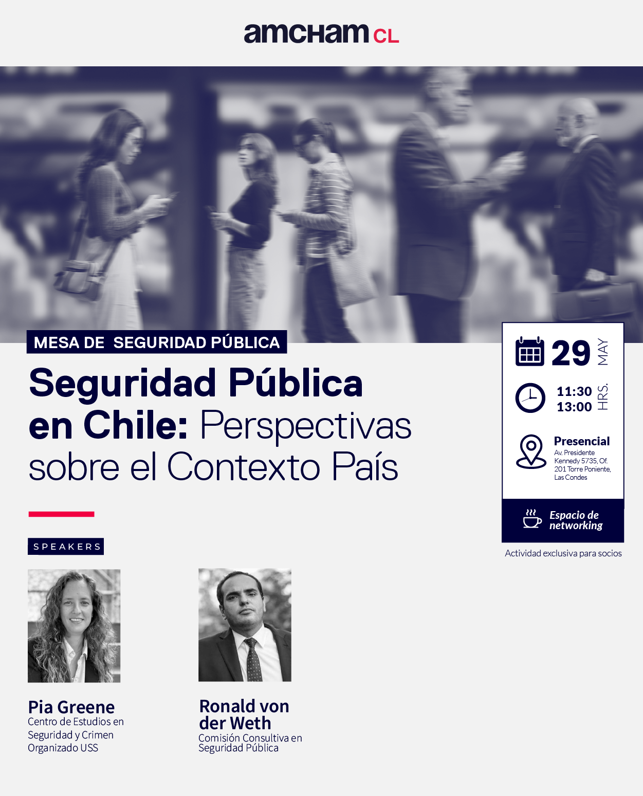 La Cámara Chilena Norteamericana de Comercio, AmCham Chile, a través de la Mesa de Seguridad Pública, realizará el conversatorio “Seguridad Pública en Chile: Perspectivas sobre el Contexto País”.