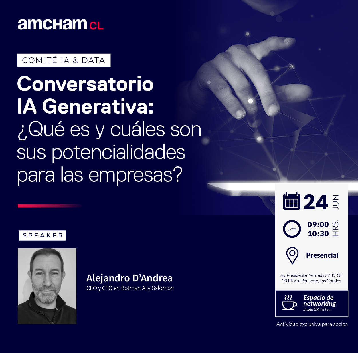El Comité de Inteligencia Artificial y Data de AmCham te invita al conversatorio «IA Generativa: ¿Qué es y cuáles son sus potencialidades para las empresas?», el próximo 26 de junio de 09:00 a 10:30 horas en formato presencial.