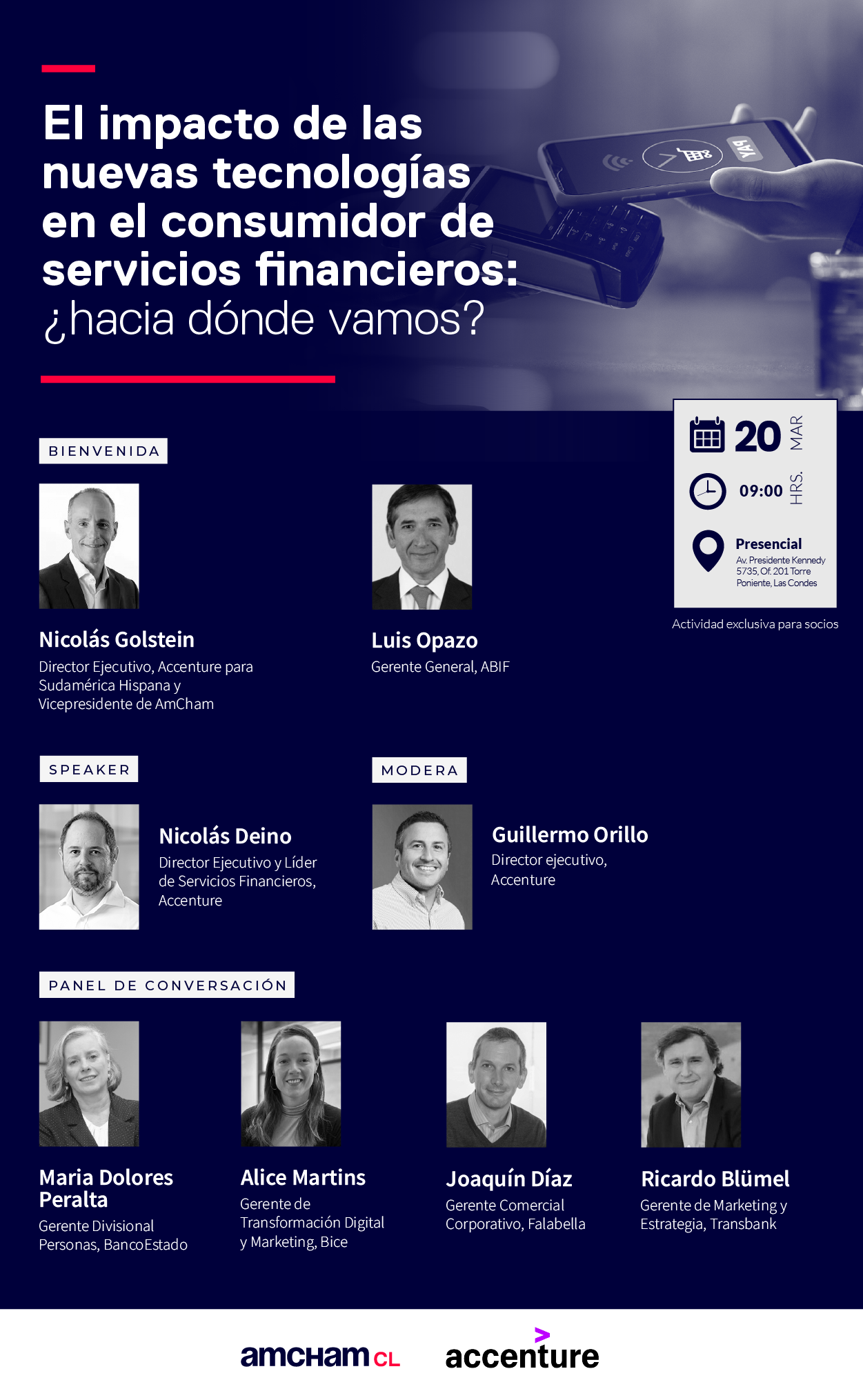AmCham Chile, en conjunto con su socio auspiciador Accenture te invitan a participar del conversatorio «El Impacto de las nuevas tecnologías en el consumidor de servicios financieros, en el que se abordarán las transformaciones que el consumidor está presentando y las tendencias que marcarán el futuro de este mercado. Lo anterior, en vista de la incorporación de nuevas tecnologías en el mundo financiero y la banca. Además, se presentará el estudio Global Banking Consumer Study.