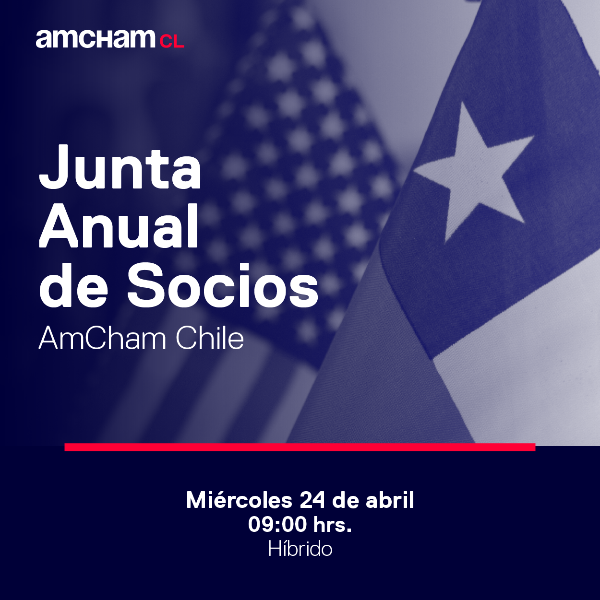 Te invitamos a participar en nuestra Junta Anual de Socios, el próximo miércoles 24 de abril a partir de las 09:00 hrs. En esta oportunidad Roberta Valenca, Presidenta de AmCham, y Paula Estévez, Gerente General, darán a conocer los resultados de la gestión 2023 y presentarán la estrategia 2024, junto con las prioridades temáticas de nuestros Comités y Mesas de Políticas Públicas.
