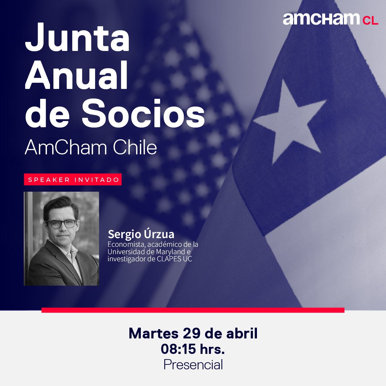AmCham Chile realizará su Junta Anual de Socios el martes 29 de abril, a partir de las 08:15 hrs., en sus oficinas ubicadas en Av. Presidente Kennedy 5735, oficina 201, Las Condes.