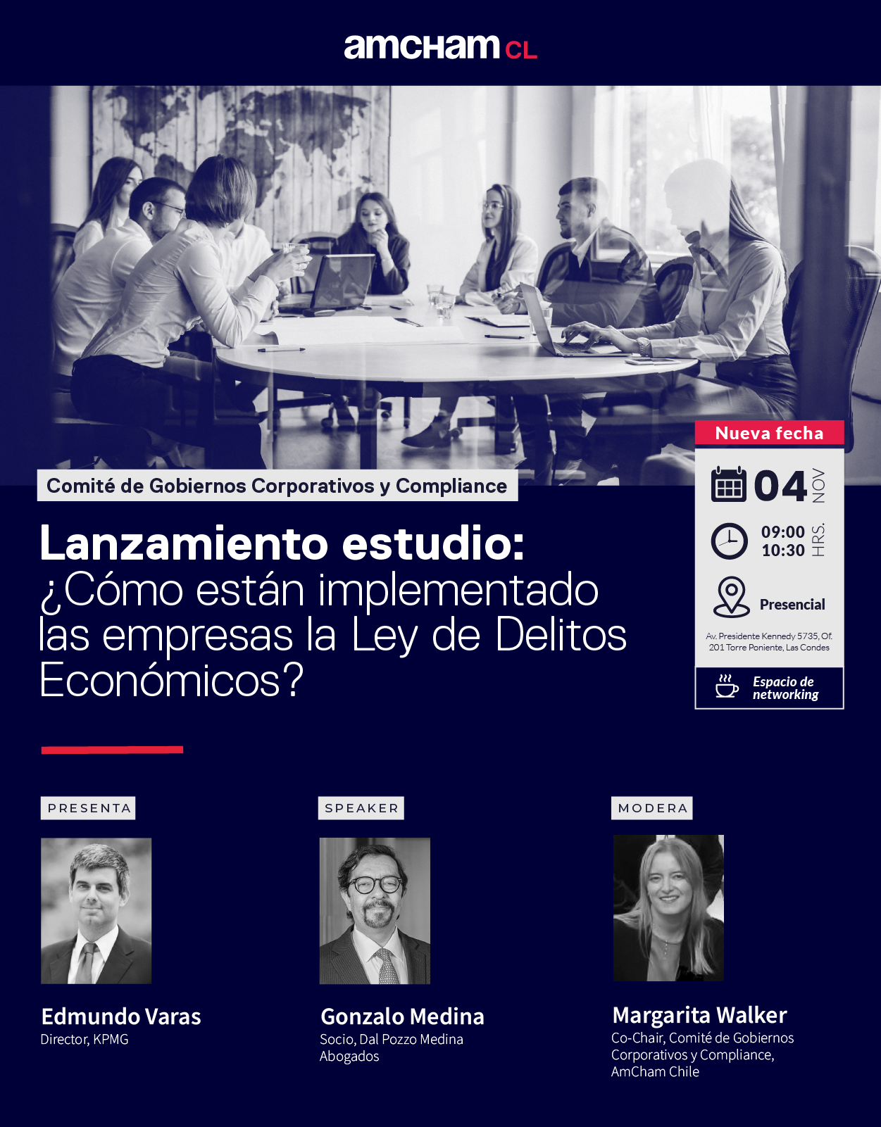 La Cámara Chilena Norteamericana de Comercio, AmCham Chile, a través de su Comité de Gobiernos Corporativos y Compliance, realizará la presentación de los resultados de una encuesta elaborada en conjunto con KPMG, dirigida a especialistas en cumplimiento legal, que revela cómo las empresas han enfrentado los desafíos normativos, operativos y culturales tras la entrada en vigor de la Ley N° 21.595.