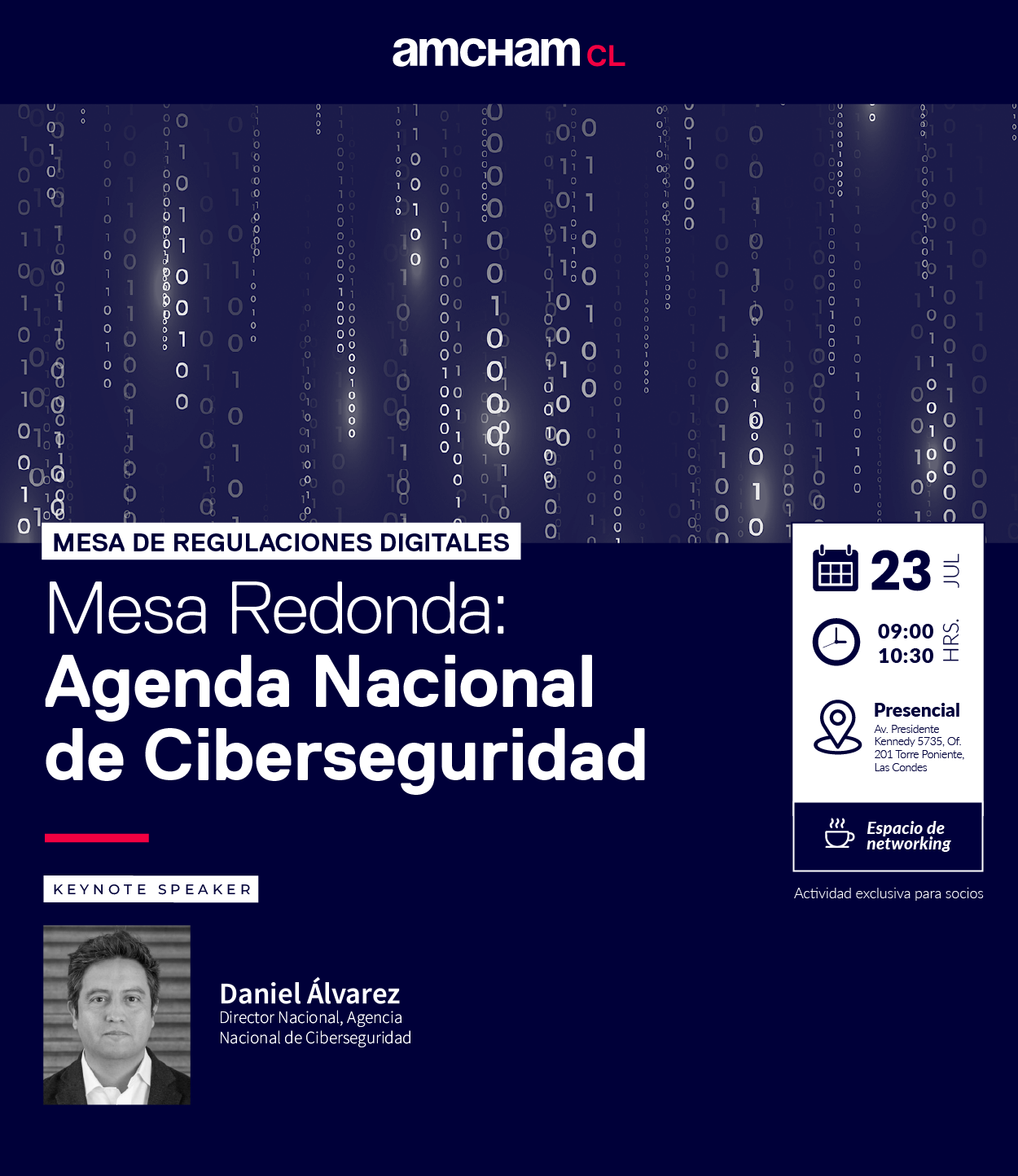 La Cámara Chilena Norteamericana de Comercio, AmCham Chile, a través de su Mesa de Regulaciones Digitales, realizará una mesa redonda con Daniel Álvarez, director nacional de la Agencia Nacional de Ciberseguridad (ANCI), el miércoles 23 de julio de 2025, entre las 09:00 y 10:30 hrs, en las oficinas de AmCham Chile, ubicadas en Av. Presidente Kennedy 5735, Torre Poniente, oficina 201, Las Condes.