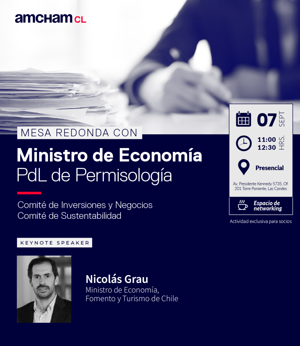 El Comité de Inversiones y Negocios y el Comité de Sustentabilidad de AmCham Chile realizará una mesa redonda con el Ministro de Economía, Nicolás Grau, a realizarse el jueves 7 de septiembre a las 11:00 hrs.