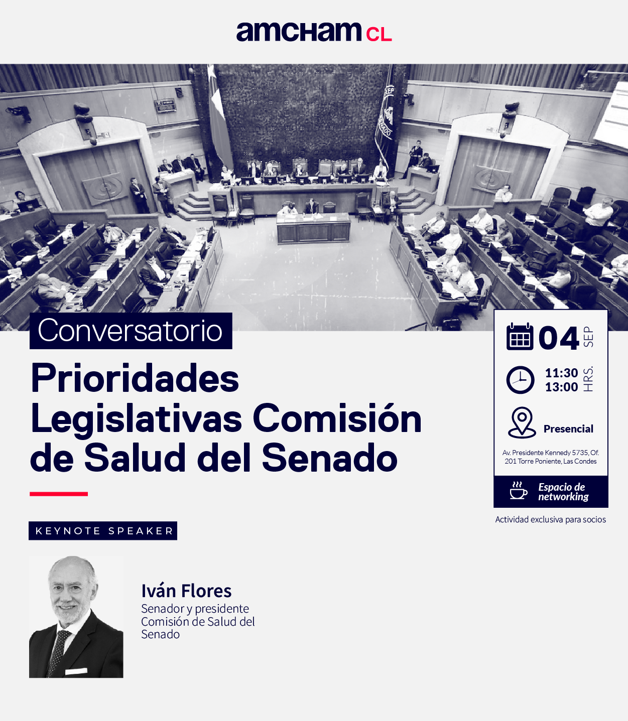 La Cámara Chilena Norteamericana de Comercio, AmCham Chile, realizará el conversatorio “Prioridades Legislativas de la Comisión de Salud del Senado”, el jueves 4 de septiembre, entre las 11:30 y 13:00 hrs, en las oficinas de AmCham Chile, ubicadas en Av. Presidente Kennedy 5735, piso 2, Las Condes.