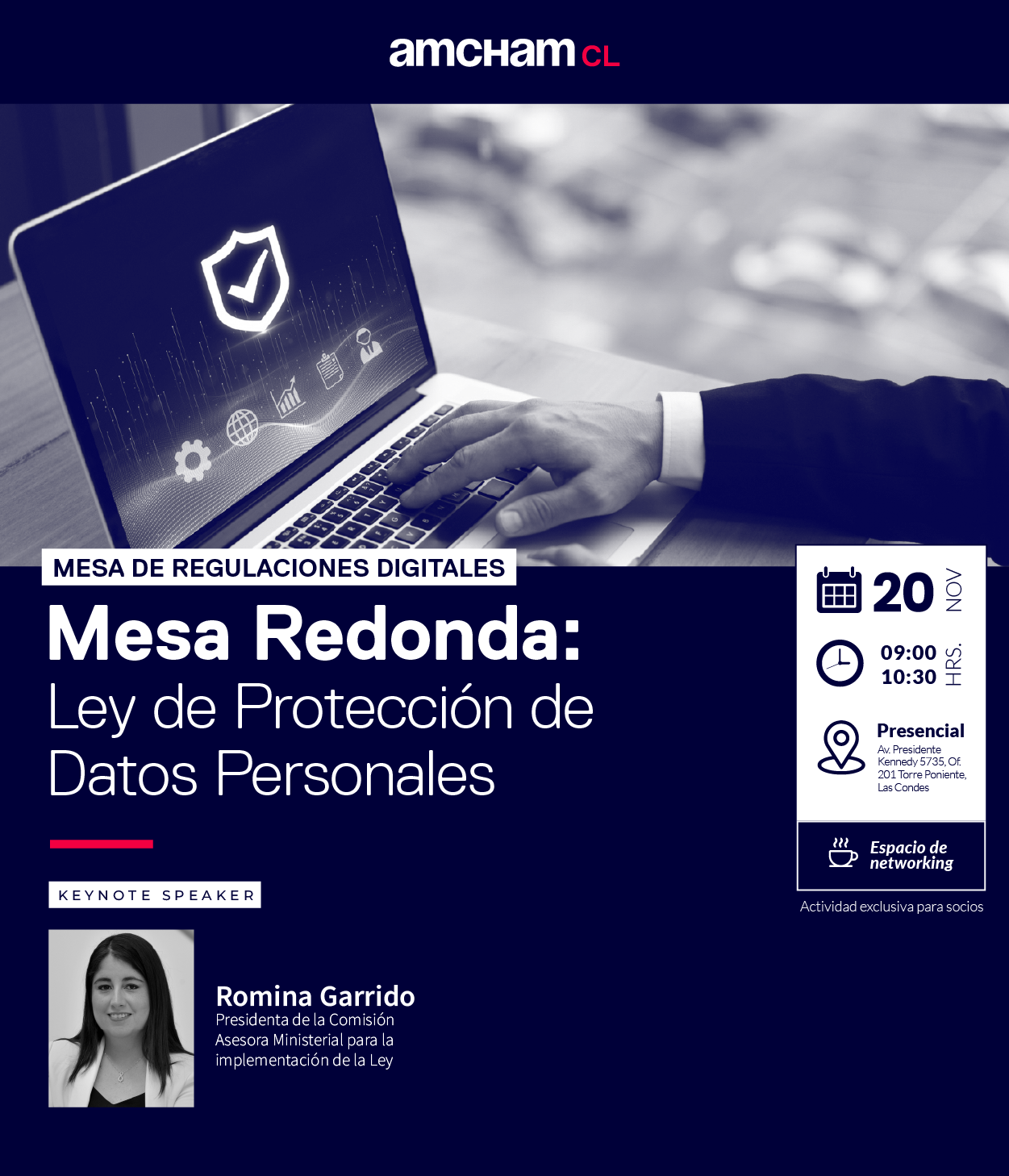 La Cámara Chilena Norteamericana de Comercio, AmCham Chile, a través de su Mesa de Regulaciones Digitales, realizará una mesa redonda con Romina Garrido, presidenta de la Comisión Asesora Ministerial para la implementación de la Ley de Protección y Tratamiento de Datos Personales.