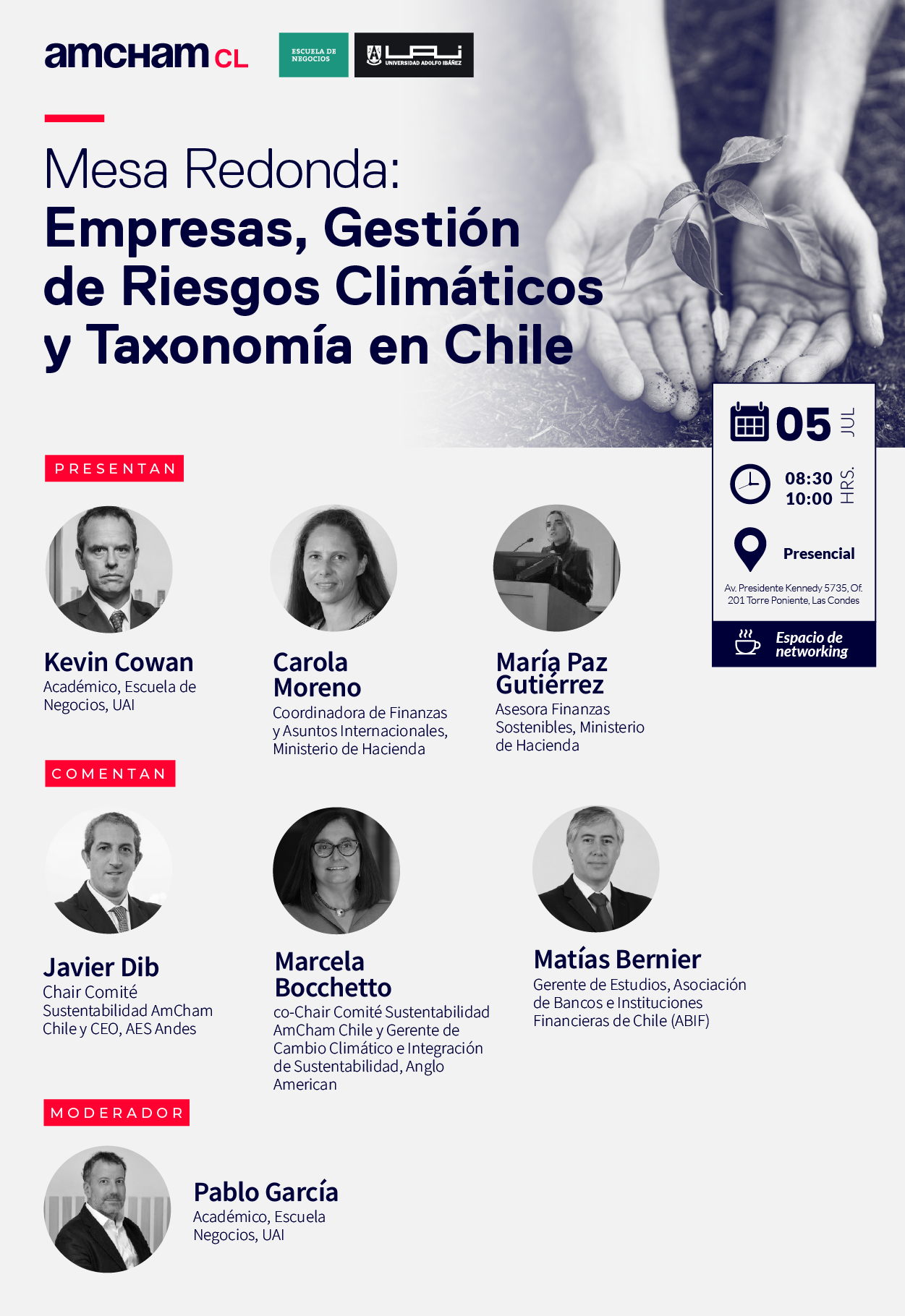 El Comité de Sustentabilidad de AmCham y el Centro Futuros Empresariales de la Universidad Adolfo Ibáñez te invitan a la Mesa Redonda «Empresas, Riesgos Climáticos y Taxonomía para Chile».
