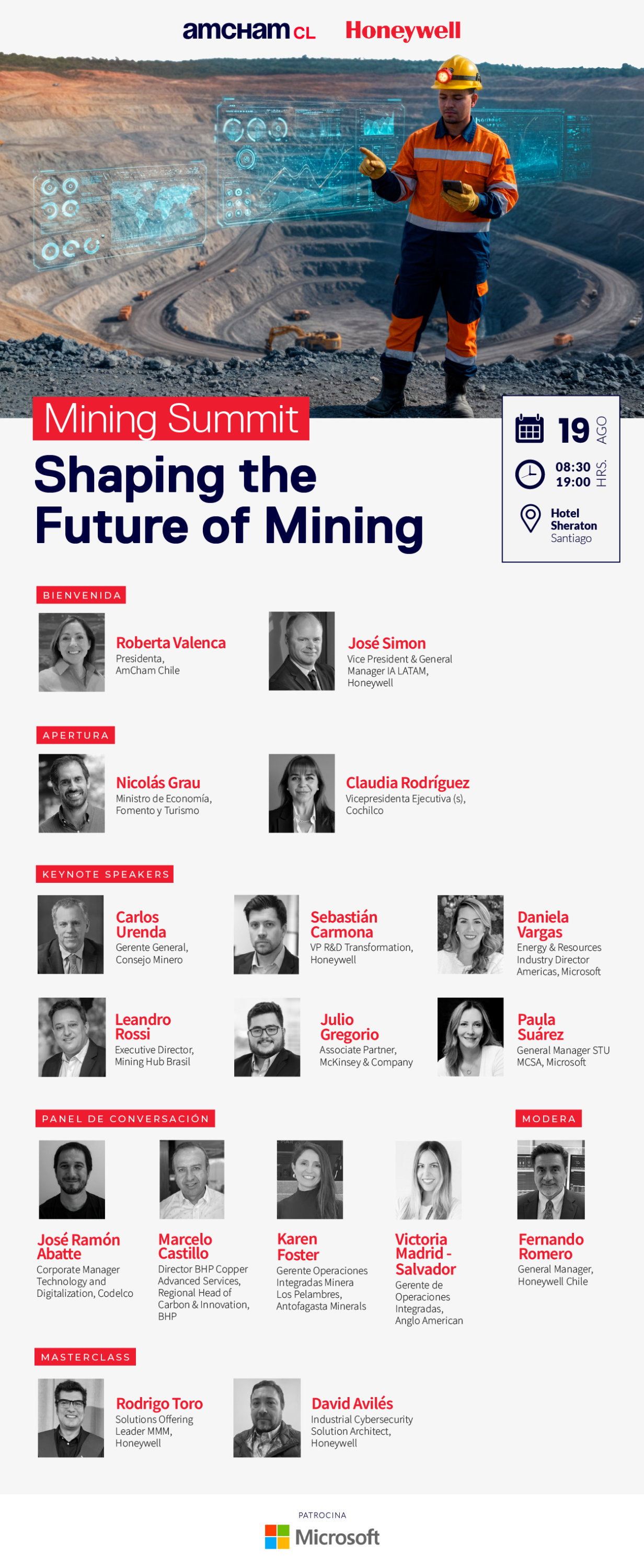 La Cámara Chilena Norteamericana de Comercio, AmCham Chile, en colaboración con Honeywell, realizará la segunda versión del Mining Summit: “Shaping the Future of Mining”, el martes 19 de agosto, a las 09:00 hrs, en el Hotel Sheraton Santiago, ubicado en Av. Santa María 1742, Providencia, Santiago.