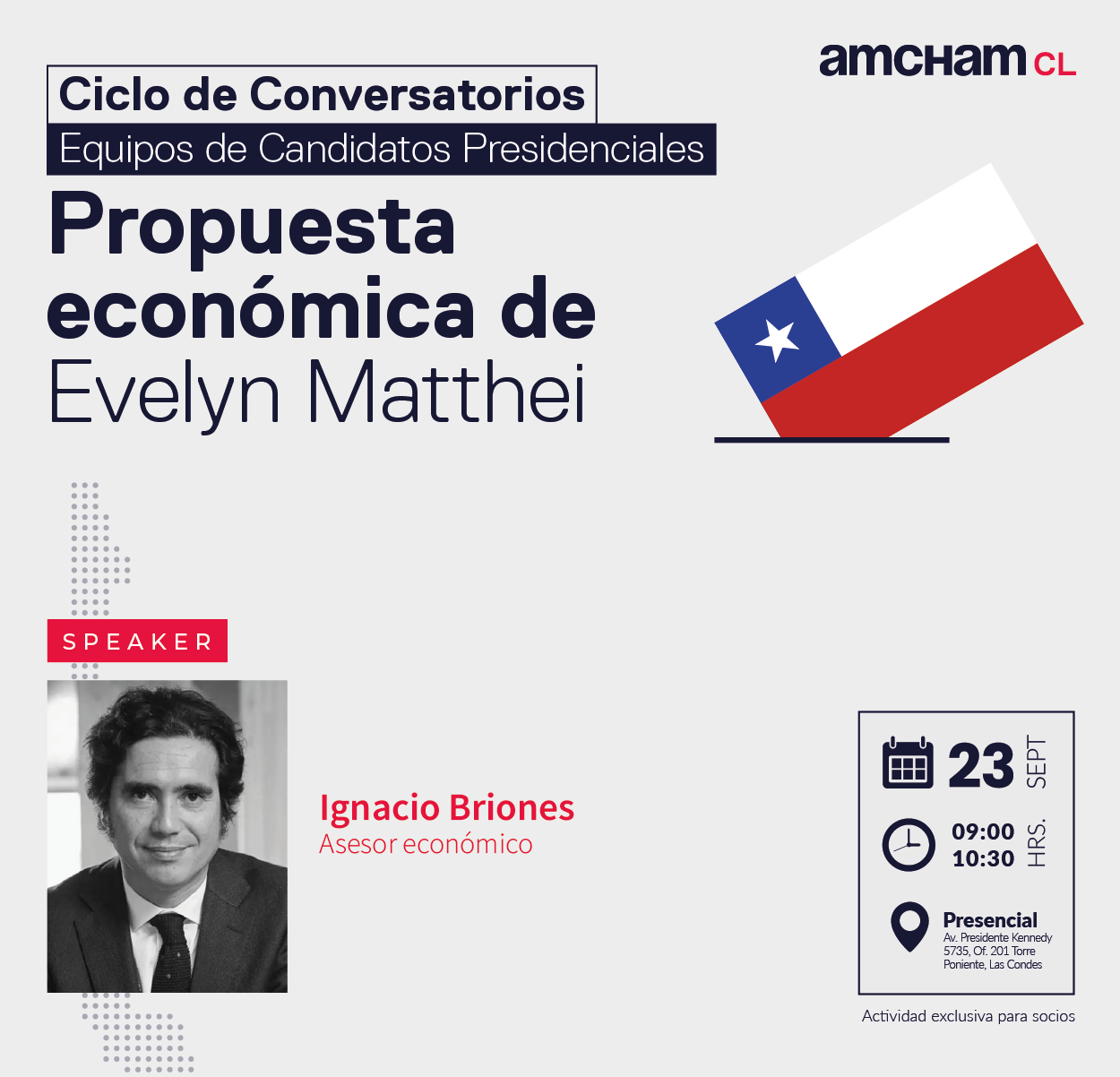 En esta oportunidad, contaremos con la participación de Ignacio Briones, asesor económico del comando de la candidata Evelyn Matthei, quien expondrá los ejes centrales de su propuesta programática. Posteriormente, se abrirá un espacio de diálogo e intercambio con los socios.