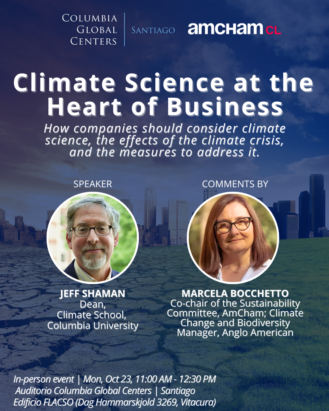 En esta oportunidad, contaremos con una presentación del Columbia University Climate School Dean, Dr. Jeff Shaman, y comentarios de parte de la co-Chair del Comité de Sustentabilidad de AmCham Chile, Marcela Bocchetto. La conversación se realizará en inglés.