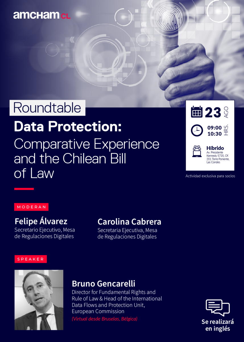 La Cámara Chilena Norteamericana de Comercio, AmCham Chile, a través la Mesa de Regulaciones Digitales, llevará a cabo el Roundtable «Data Protection: Comparative Experience and the Chilean Bill of Law», el próximo 23 de agosto de 09:00 a 10:30 horas.