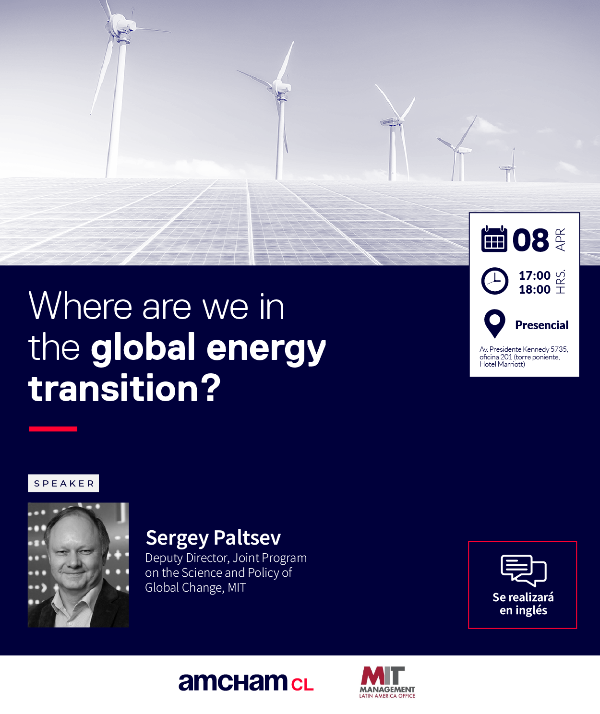 AmCham Chile y la Oficina de Latinoamérica de la Escuela de Negocios Sloan del Instituto Tecnológico de Massachusetts (MIT), te invitan a la Mesa Redonda ‘Where Are We in the Global Energy Transition?’ el lunes 8 de abril a las 17:00 en oficinas de AmCham.