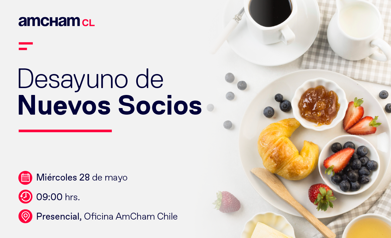 La Cámara Chilena Norteamericana de Comercio, AmCham Chile, realizará un desayuno de bienvenida para nuevos socios el miércoles 28 de mayo a las 9:00 horas en sus oficinas, junto a Roberta Valenca, presidenta de AmCham Chile, y miembros del Directorio.