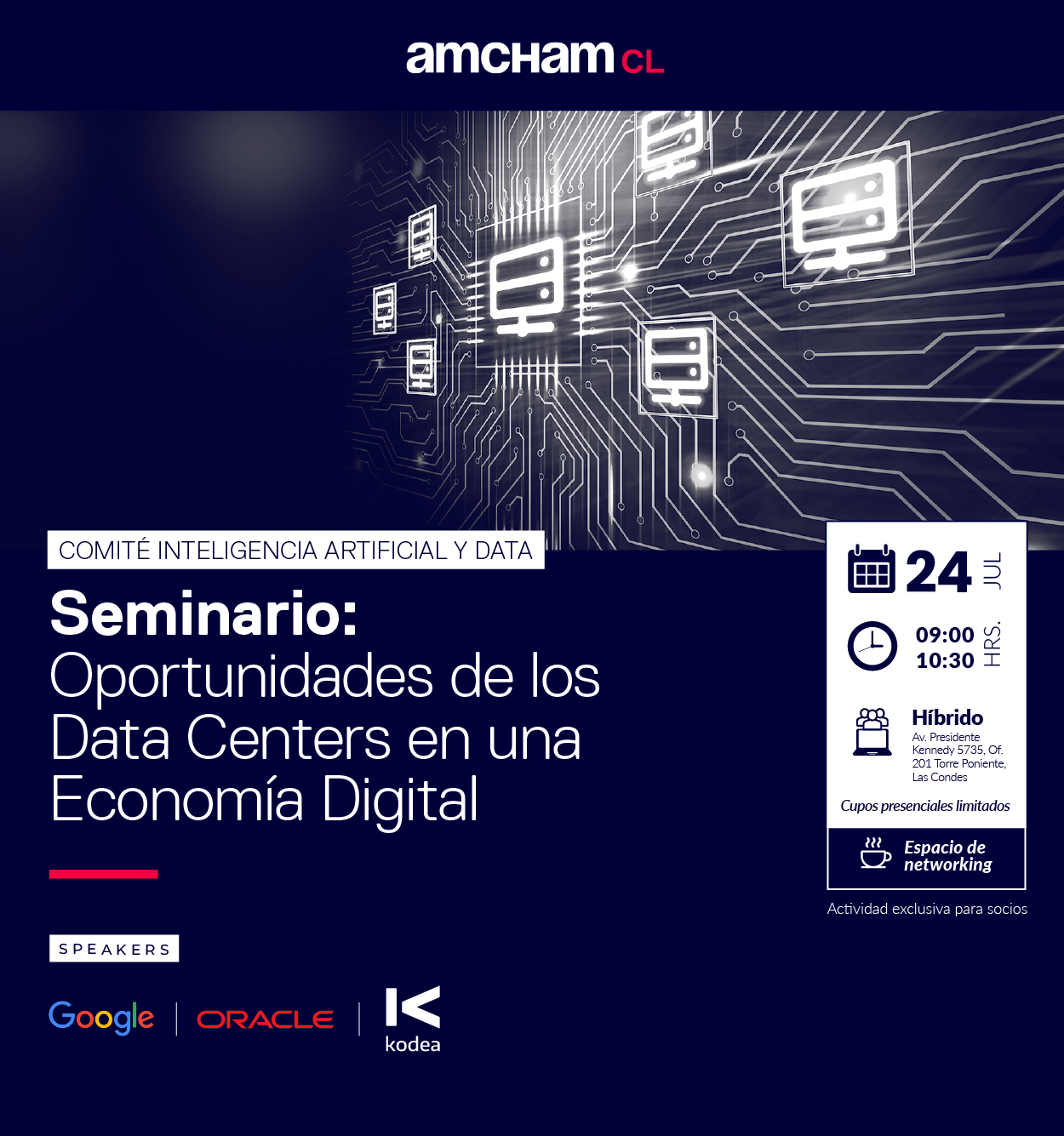 AmCham y su Comité de Inteligencia Artificial y Data te invitan a participar de el Seminario «Oportunidades de los Data Centers en una Economía Digital», el miércoles 24 de julio de 09:00 a 10:30 hrs en formato híbrido.