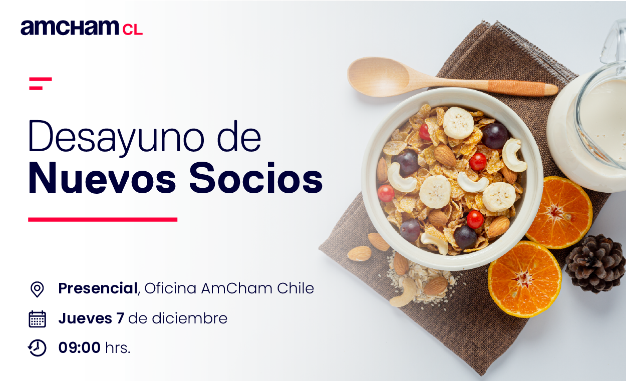 La Cámara Chilena Norteamericana de Comercio, AmCham Chile, tiene el agrado de invitarte a participar de un desayuno en nuestras oficinas para darle la bienvenida a los nuevos socios. Esta instancia se realizará el jueves 7 de diciembre a las 9:00 horas junto a Sergio Rademacher, presidente de AmCham Chile, y miembros de nuestro Directorio.