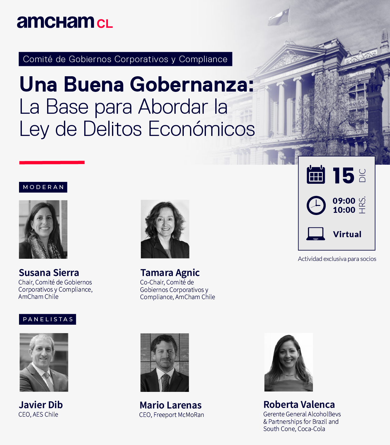 El Comité de Gobiernos Corporativos y Compliance de AmCham tiene el agrado de invitarte a participar en el webinar Una Buena Gobernanza: La Base para Abordar la Ley de Delitos Económicos, a realizarse el próximo 15 de diciembre a las 9:00 hrs. en formato virtual.