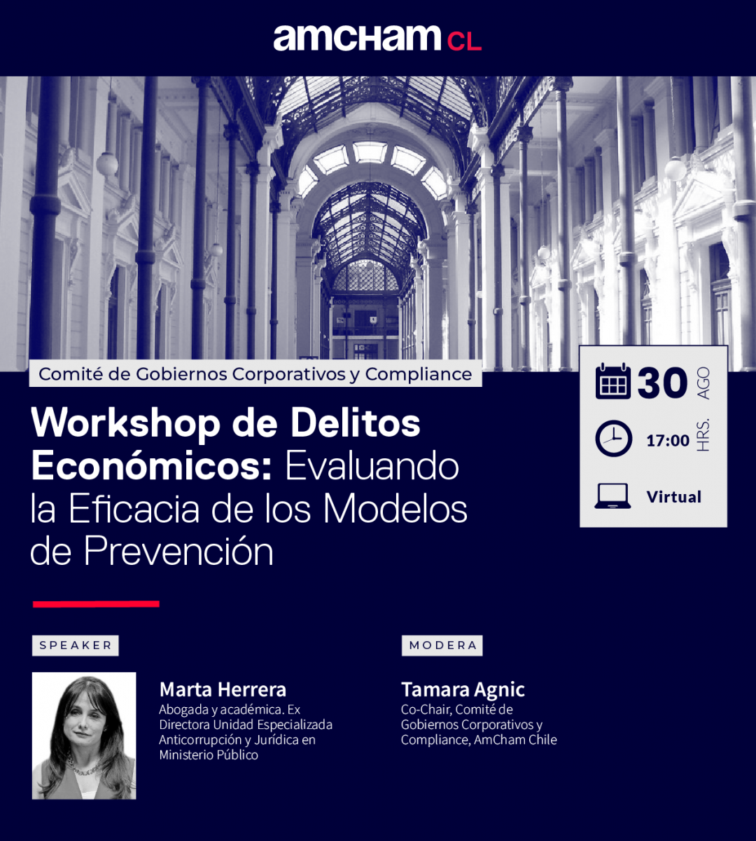 El Comité de Gobiernos Corporativos y Compliance de AmCham relizará un nuevo workshop en el cual nuestros socios trabajarán colaborativamente en analizar la Ley de Delitos Económicos, además de sus implicancias y posibles estrategias de prevención y de cumplimiento.
